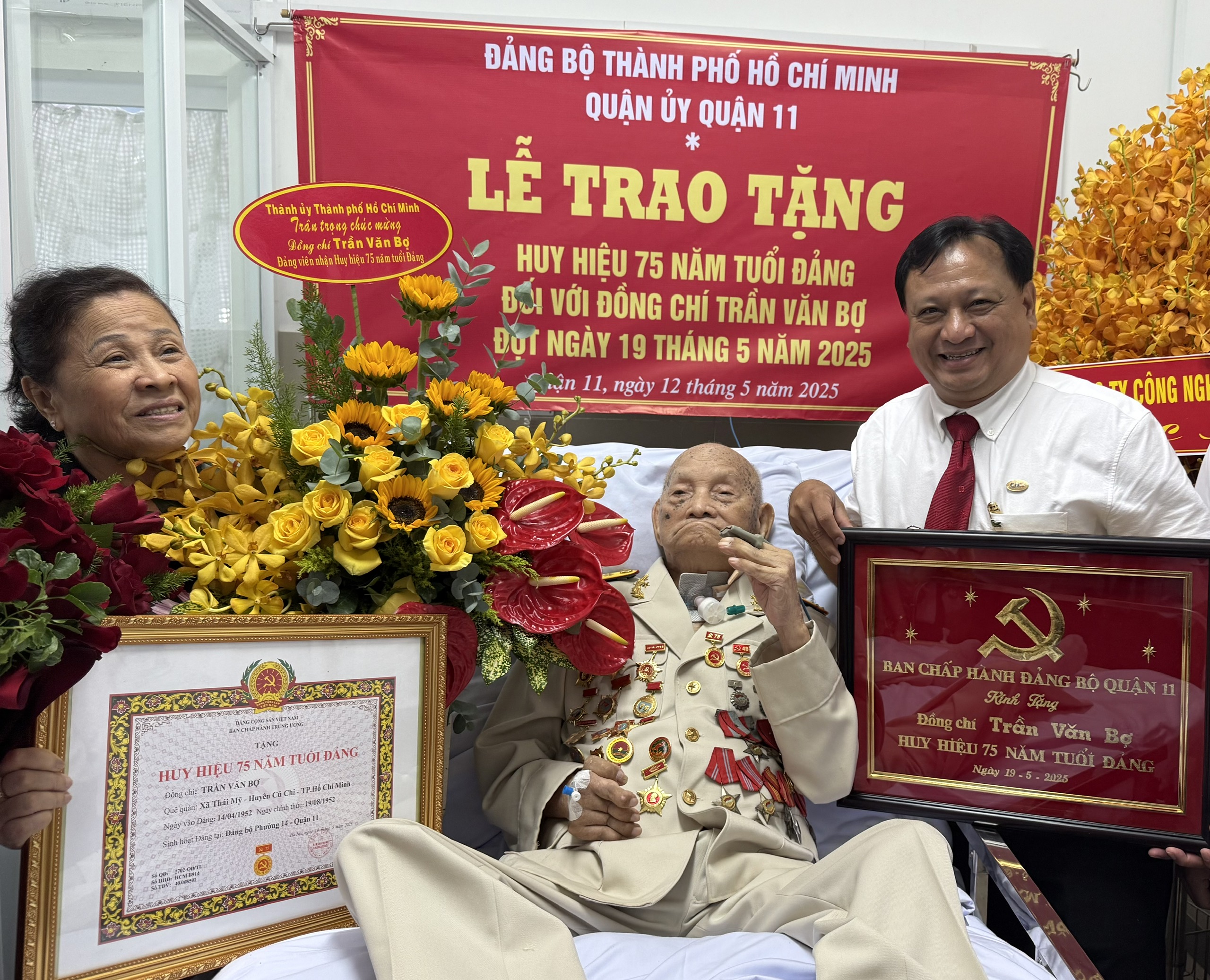 Tại buổi lễ, Bí thư Quận ủy quận 11 Trương Quốc Lâm đã trao Huy hiệu 75 năm tuổi Đảng cho đảng viên Trần Văn Bợ. Đồng thời, gửi lời chúc mừng và lời thăm hỏi, chúc sức khỏe đến ông Trần Văn Bợ. Bí thư Quận ủy quận 11 mong muốn ông Trần Văn Bợ mạnh khỏe, luôn là tấm gương sáng để con cháu noi theo.