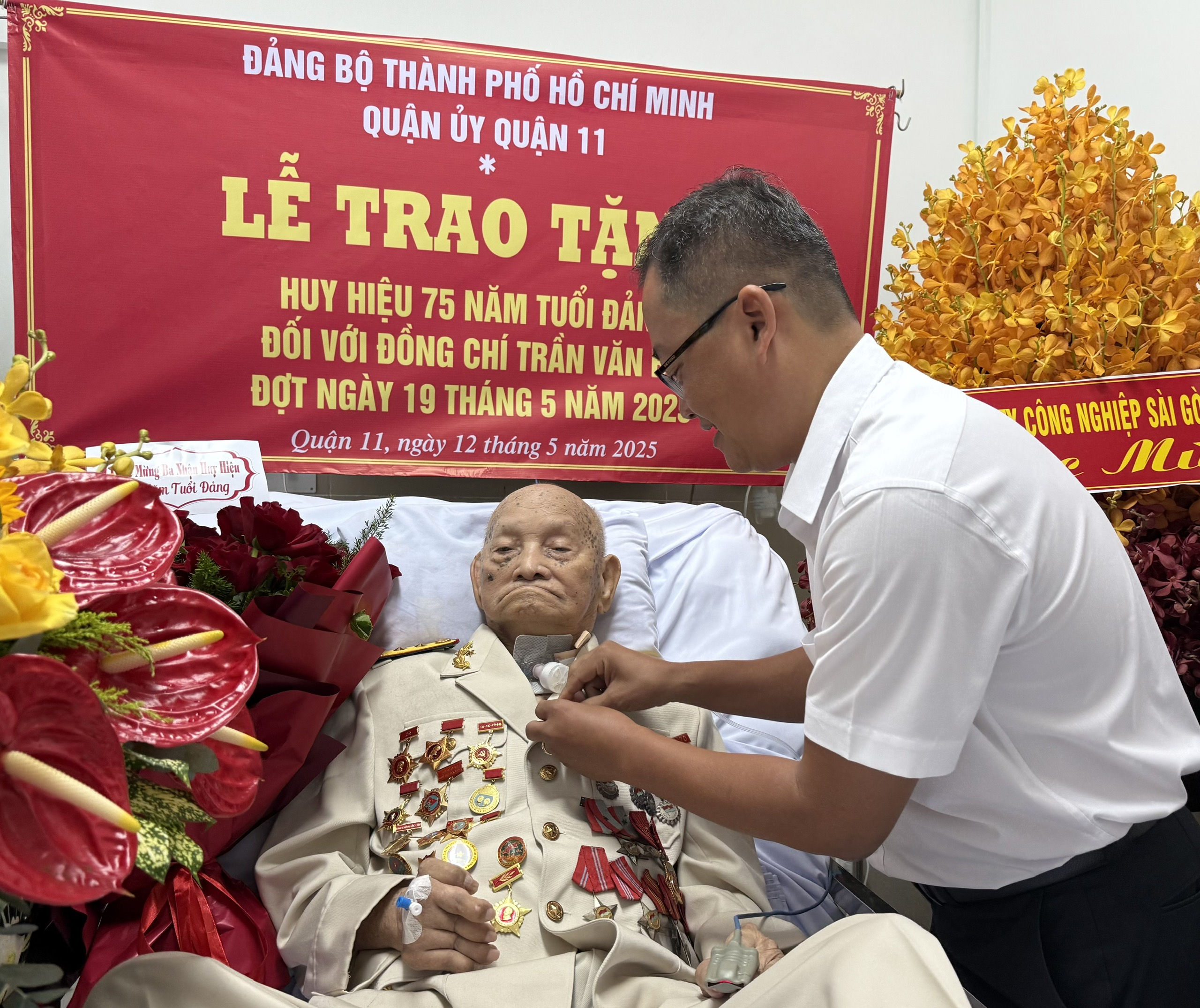 Bí thư Quận ủy quận 11 Trương Quốc Lâm trao Huy hiệu 75 năm tuổi Đảng cho đảng viên Trần Văn Bợ