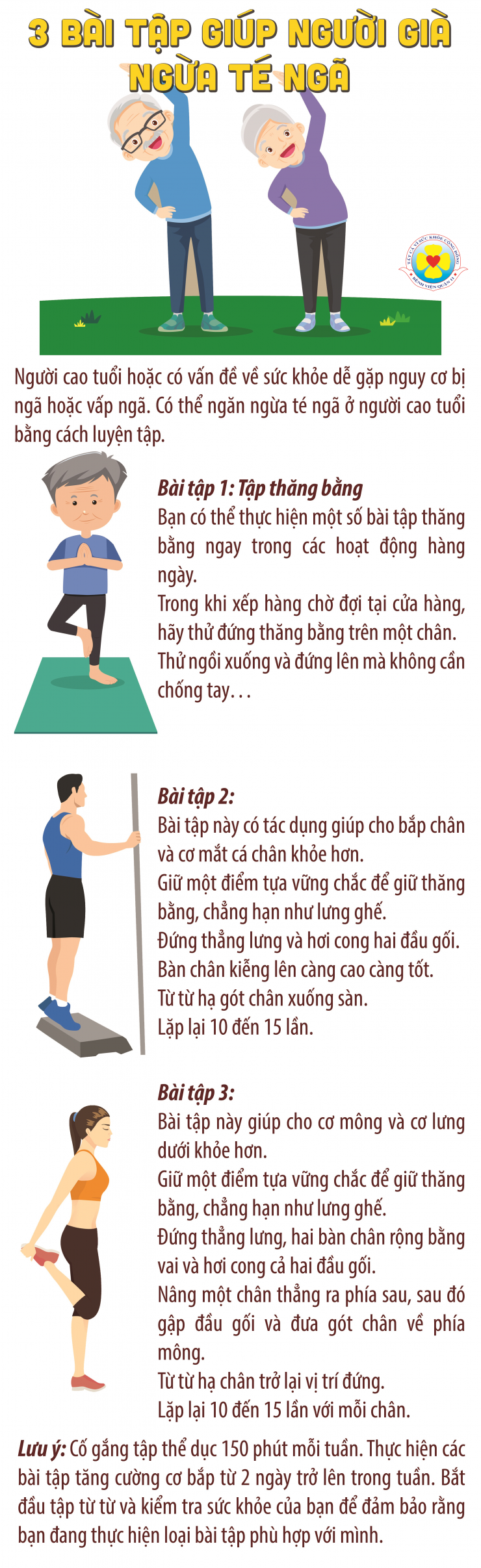 Người cao tuổi hoặc có vấn đề về sức khỏe dễ gặp nguy cơ bị ngã hoặc vấp ngã. Có thể ngăn ngừa té ngã ở người cao tuổi bằng cách luyện tập như sau: