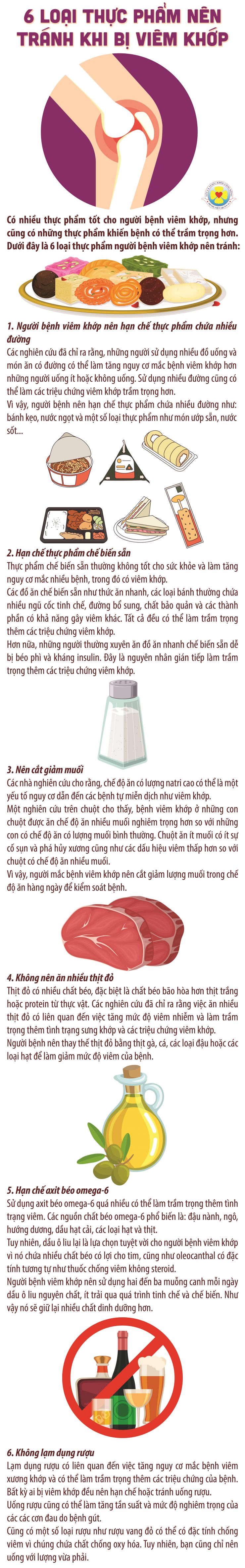 Có nhiều thực phẩm tốt cho người bệnh viêm khớp, nhưng cũng có những thực phẩm khiến bệnh có thể trầm trọng hơn. Dưới đây là 6 loại thực phẩm người bệnh viêm khớp nên tránh: