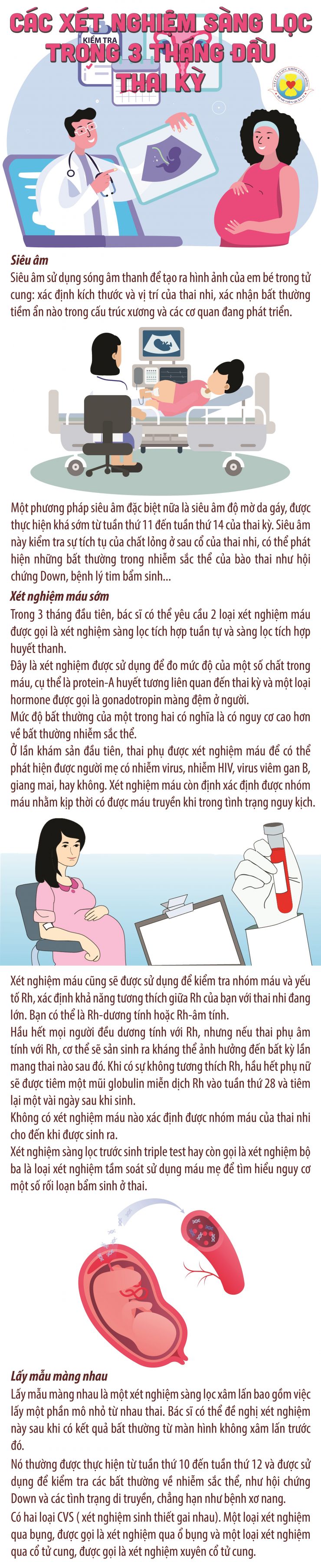 Trong quá trình mang thai, ngoài việc sản phụ khám thai định kỳ, quản lý thai nghén an toàn, thai phụ cần xét nghiệm sàng lọc trước sinh để đảm bảo sức khỏe thai phụ và an toàn cho thai nhi.