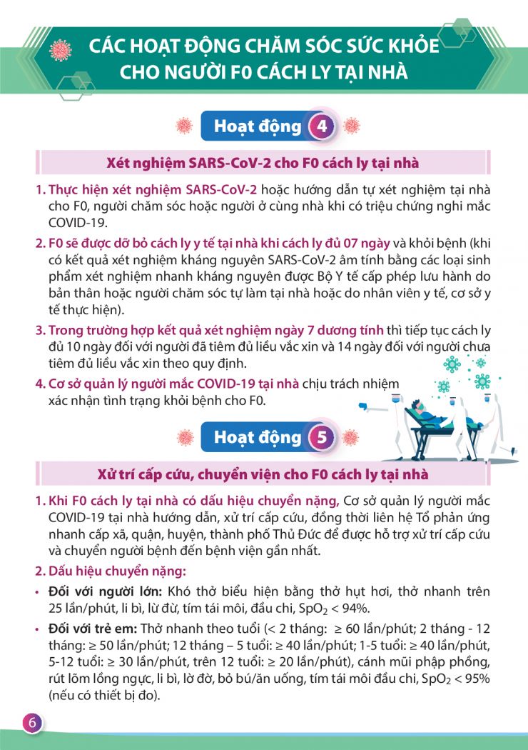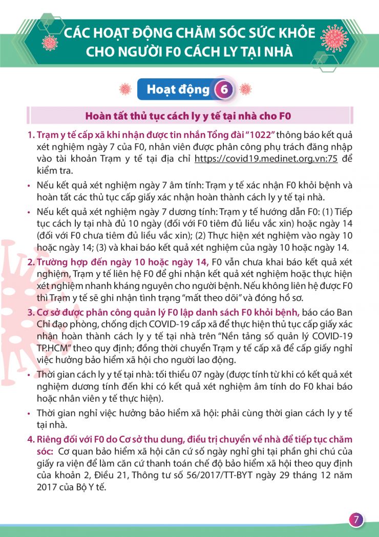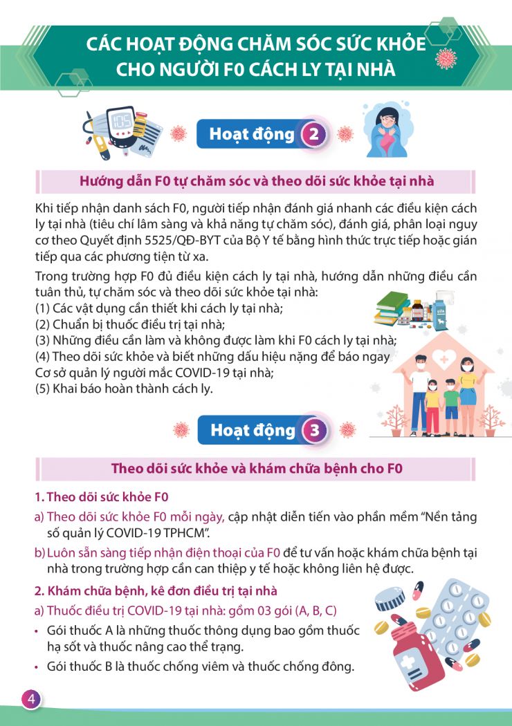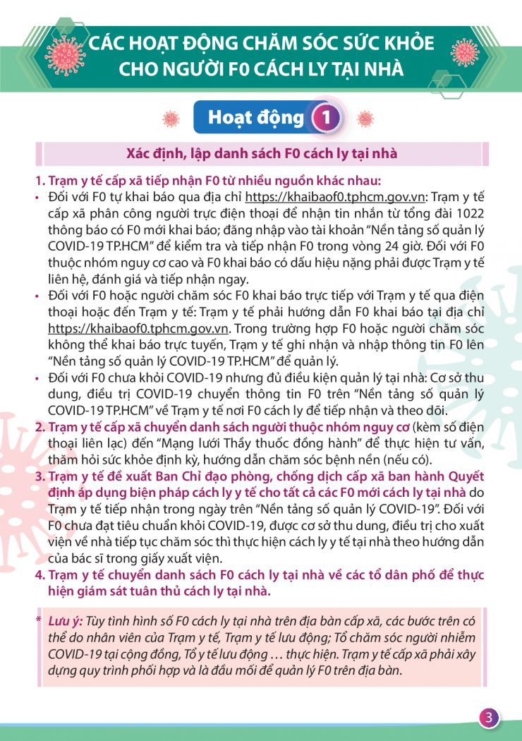 Theo đó, sau khi tiếp nhận F0 từ nhiều nguồn khác nhau (F0 tự khai báo qua địa chỉ https://khaibaof0.tphcm.gov.vn; F0 hoặc người chăm sóc F0 khai báo trực tiếp với Trạm y tế qua điện thoại hoặc đến Trạm y tế; F0 chưa khỏi COVID-19 nhưng đủ điều kiện quản lý tại nhà), Trạm y tế cấp xã thực hiện đánh giá nhanh các điều kiện cách ly tại nhà. Nếu F0 đủ điều kiện cách ly tại nhà thì chuyển danh sách về các tổ dân phố để thực hiện giám sát tuân thủ cách ly tại nhà; chuyển danh sách người thuộc nhóm nguy cơ (kèm số điện thoại liên lạc) đến “Mạng lưới Thầy thuốc đồng hành” để thực hiện tư vấn, thăm hỏi sức khỏe định kỳ, hướng dẫn chăm sóc bệnh nền (nếu có).
