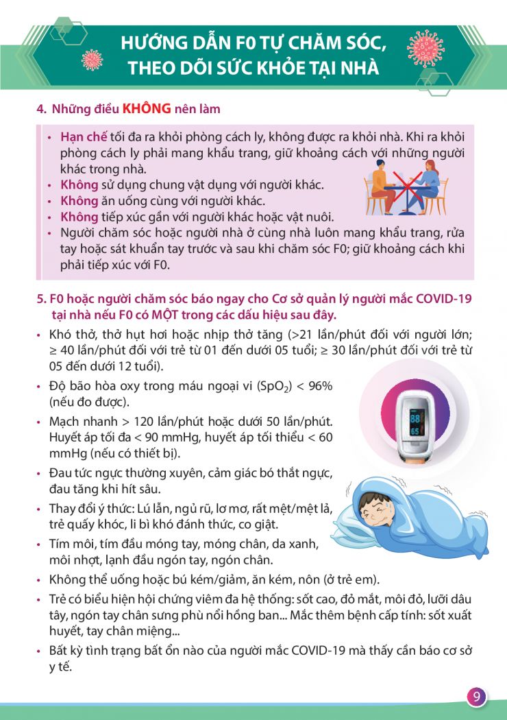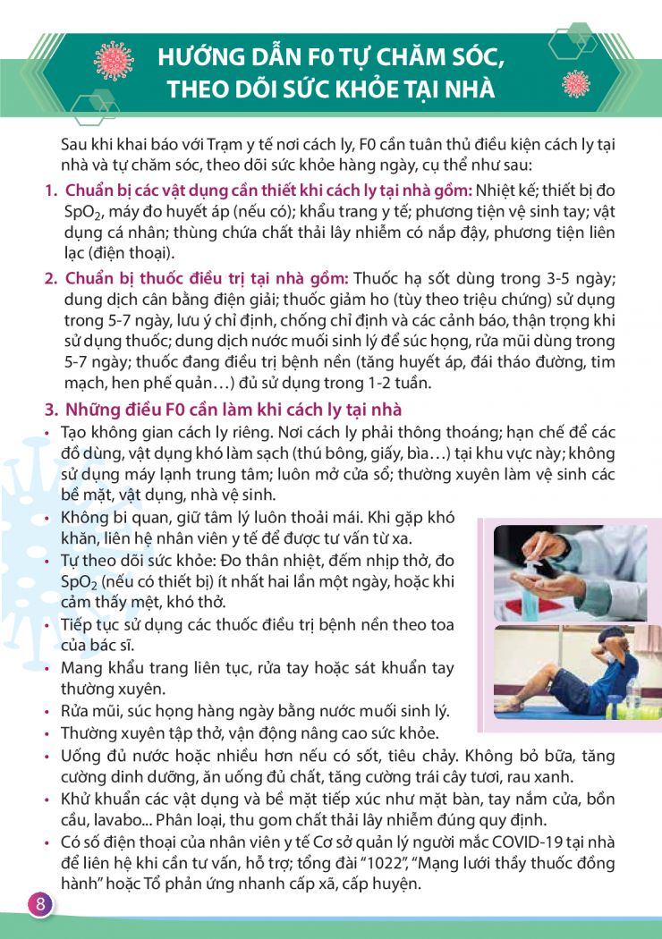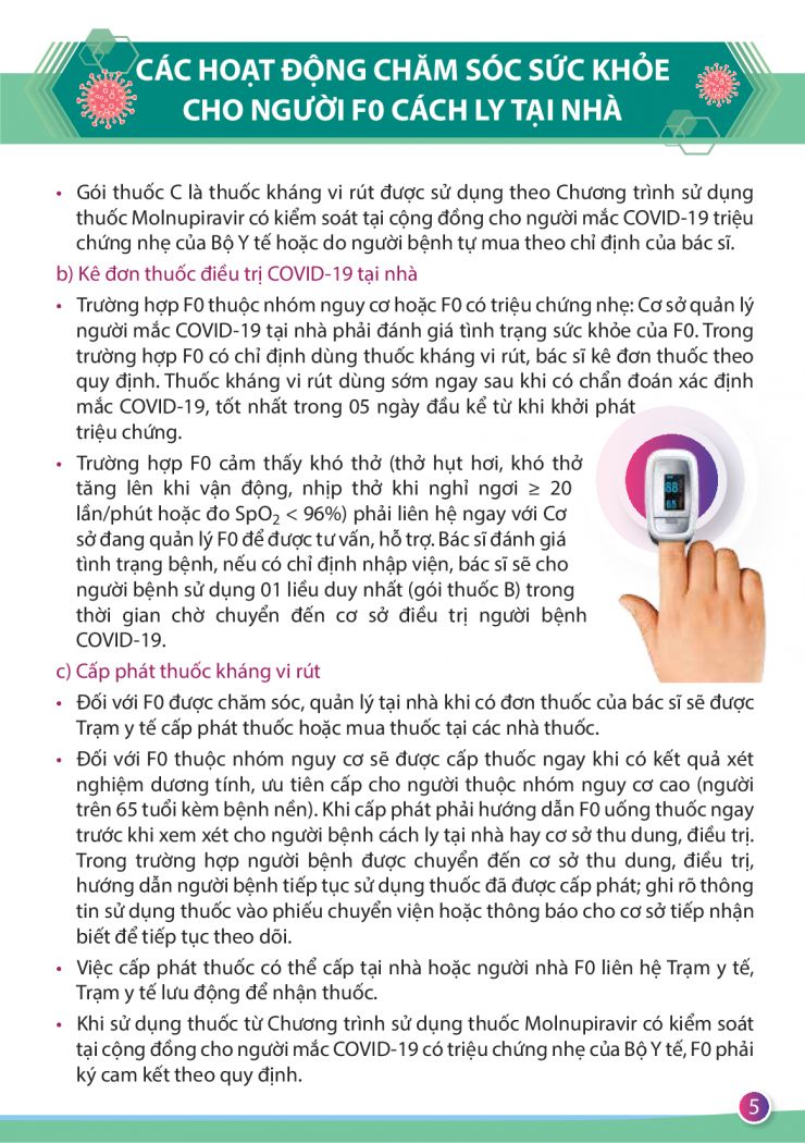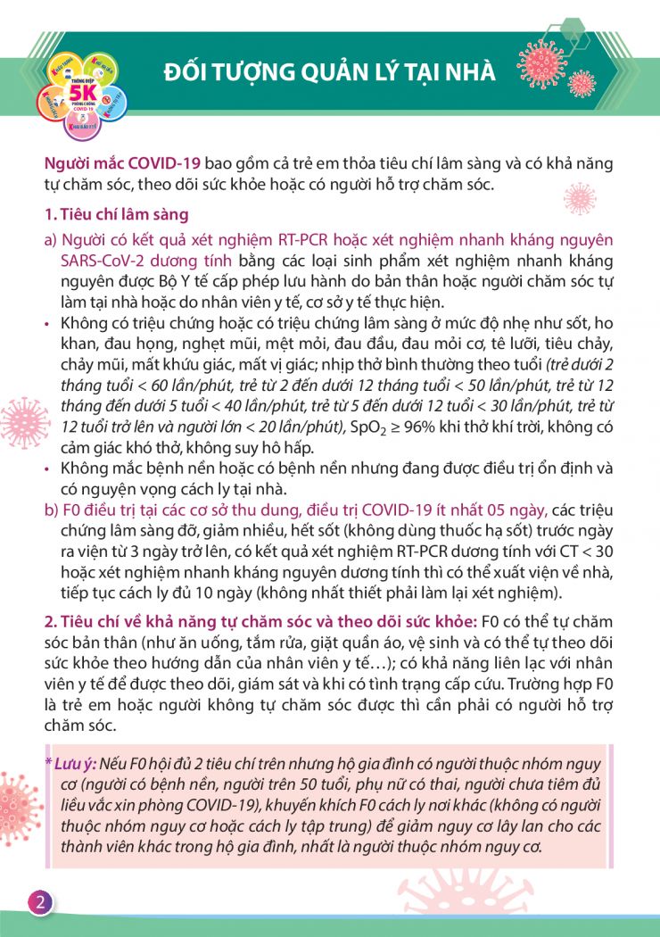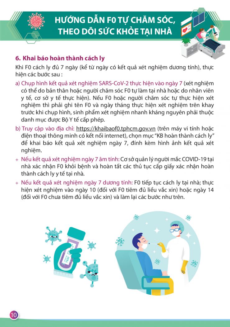 Theo đó, sau khi tiếp nhận F0 từ nhiều nguồn khác nhau (F0 tự khai báo qua địa chỉ https://khaibaof0.tphcm.gov.vn; F0 hoặc người chăm sóc F0 khai báo trực tiếp với Trạm y tế qua điện thoại hoặc đến Trạm y tế; F0 chưa khỏi COVID-19 nhưng đủ điều kiện quản lý tại nhà), Trạm y tế cấp xã thực hiện đánh giá nhanh các điều kiện cách ly tại nhà. Nếu F0 đủ điều kiện cách ly tại nhà thì chuyển danh sách về các tổ dân phố để thực hiện giám sát tuân thủ cách ly tại nhà; chuyển danh sách người thuộc nhóm nguy cơ (kèm số điện thoại liên lạc) đến “Mạng lưới Thầy thuốc đồng hành” để thực hiện tư vấn, thăm hỏi sức khỏe định kỳ, hướng dẫn chăm sóc bệnh nền (nếu có).