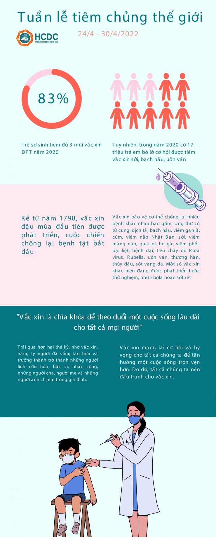 Trải qua hơn hai thế kỷ, nhờ vắc xin, hàng tỷ người đã sống lâu hơn và trưởng thành để trở thành những người lính cứu hỏa, bác sĩ, nhạc công, những người cha, người mẹ và những người anh chị em trong gia đình. Vắc xin mang lại cơ hội và hy vọng cho tất cả chúng ta tận hưởng một cuộc sống trọn vẹn hơn. Do đó, tất cả chúng ta nên đấu tranh cho vắc xin. Vì vắc xin là chìa khóa để theo đuổi một cuộc sống lâu dài cho tất cả mọi người.