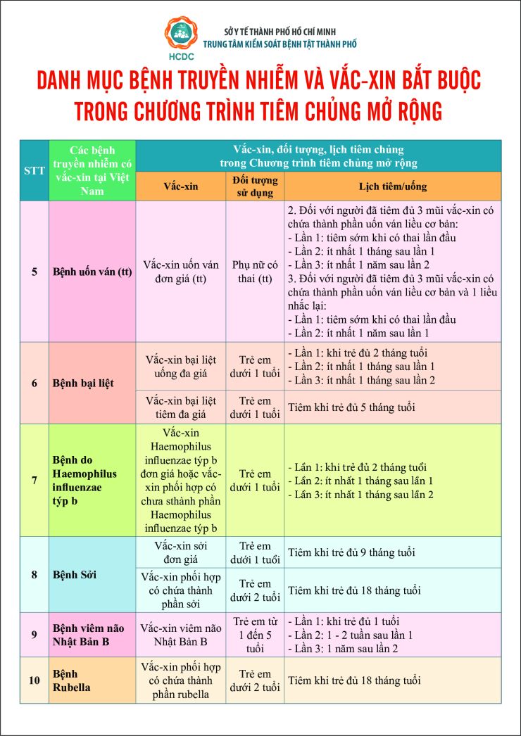 - Danh mục bệnh truyền nhiễm và vắc-xin bắt buộc trong Chương trình Tiêm chủng mở rộng bao gồm: Viêm gan B, Lao, Bạch hầu, Ho gà, Uốn ván, Bại liệt, Bệnh do Heamophilus Inffluenzae týp B, Sởi, Viêm não Nhật Bản, Rubella.
