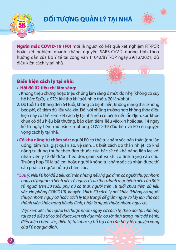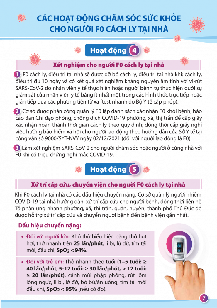 F0 cách ly, điều trị tại nhà sẽ được dỡ bỏ cách ly, điều trị tại nhà khi cách ly, điều trị đủ 10 ngày và có kết quả xét nghiệm kháng nguyên âm tính với vi-rút SARS-CoV-2 do nhân viên y tế thực hiện hoặc người bệnh tự thực hiện dưới sự giám sát của nhân viên y tế bằng ít nhất một trong các hình thức trực tiếp hoặc gián tiếp qua các phương tiện từ xa (test nhanh do Bộ Y tế cấp phép).