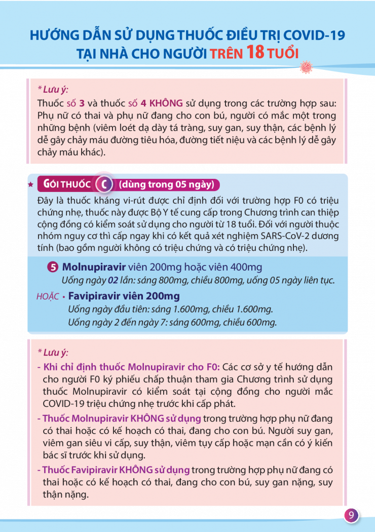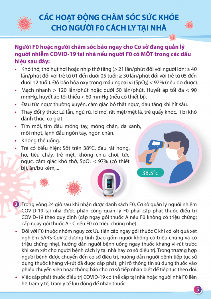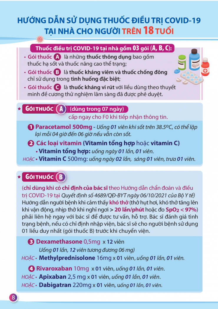 Trong vòng 24 giờ sau khi nhận được danh sách F0, Cơ sở quản lý người nhiễm COVID-19 tại nhà được phân công quản lý F0 phải cấp phát thuốc điều trị COVID-19 theo quy định (cấp ngay gói thuốc A nếu F0 không có triệu chứng; cấp ngay gói thuốc A - C nếu F0 có triệu chứng nhẹ). Đối với F0 thuộc nhóm nguy cơ, ưu tiên cấp ngay gói thuốc C khi có kết quả xét nghiệm SARS-CoV-2 dương tính, bao gồm người không có triệu chứng và có triệu chứng nhẹ.