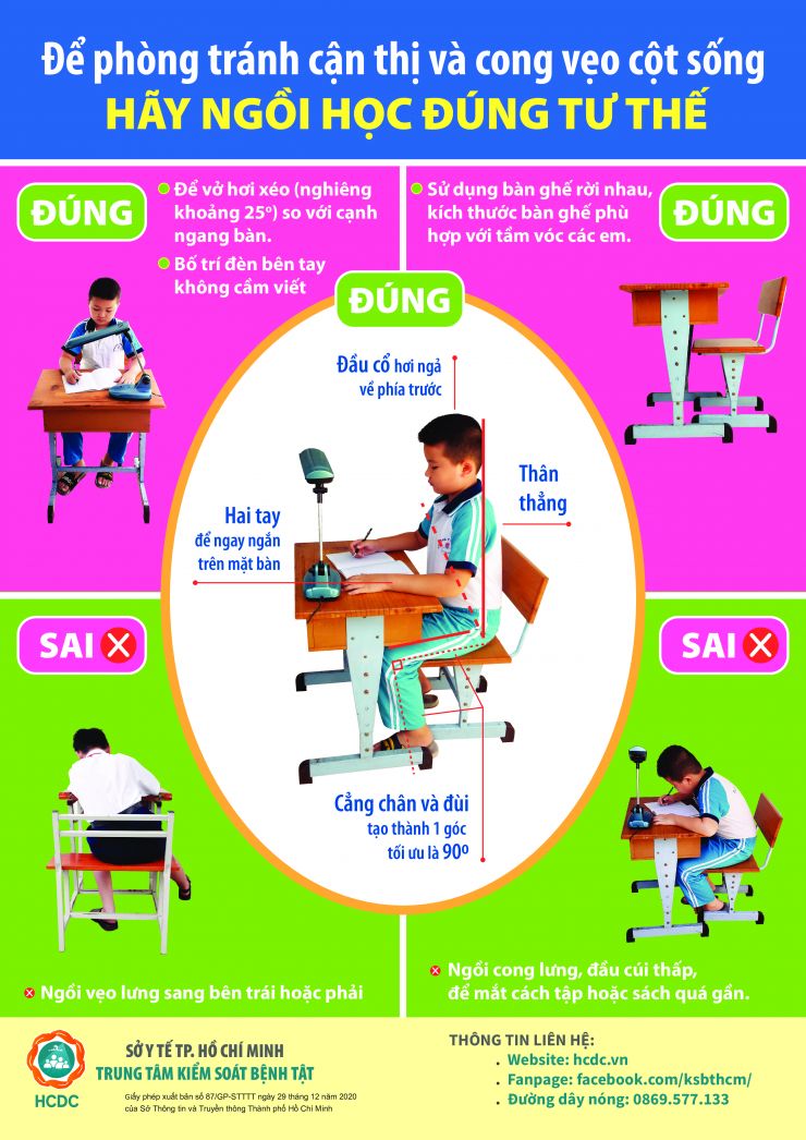 Đảm bảo ngồi học đúng tư thế: khi ngồi, hai bàn chân được đặt ngay ngắn, vững chắc trên sàn, giữa cẳng chân và đùi tạo thành 1 góc tối ưu là 900 (dao động trong khoảng 75-1050), lưng có thể tựa vào tựa lưng của ghế để tăng thêm điểm tựa, thân thẳng, đầu và cổ hơi ngả về phía trước, hai tay để ngay ngắn trên mặt bàn.