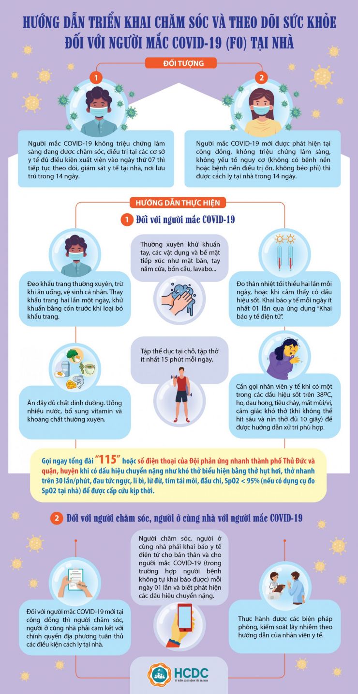 Ngoài ra trong văn bản cũng hướng dẫn những điều cần thực hiện đối với các trường hợp F0 và người chăm sóc, người ở cùng nhà với F0, đồng thời cũng nêu rõ các điều kiện về cơ sở cách ly dành cho F0 được cách ly tại nhà. Đặc biệt F0 hay người chăm sóc, người nhà cần ghi nhớ gọi ngay cho nhân viên y tế khi có một trong các dấu hiệu sốt trên 380C, ho, đau họng, tiêu chảy, mất mùi/vị, đau ngực, nặng ngực, cảm giác khó thở (khi không thể hít sâu và nín thở đủ 10 giây), khi nhịp thở > 20 lần/phút để được hướng dẫn xử trí phù hợp. Trong trường hợp có dấu hiệu chuyển nặng như khó thở biểu hiện bằng thở hụt hơi, thở nhanh trên 30 lần/phút, li bì, lừ đừ, tím tái môi, đầu chi, SpO2 < 95% (nếu có dụng cụ đo SpO2 tại nhà) thì gọi ngay tống đài “115” hoặc số điện thoại của Tổ phản ứng nhanh quận, huyện để được cấp cứu kịp thời.