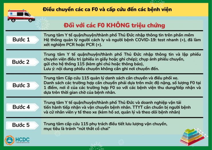 Nhằm kịp thời điều chuyển các ca F0, giảm áp lực cho hệ thống y tế của quận/huyện và giảm tử vong đối với các trường hợp F0 chuyển nặng, nguy kịch. Căn cứ tình hình thực tế và thông báo kết luận số 626/TB-VP ngày 16/7/2021 của Chủ tịch Ủy ban Nhân dân thành phố, Sở Y tế TP.HCM đã ban hành công văn số 4663/SYT-NVY về hướng dẫn điều chuyển các ca F0 và cấp cứu đến các bệnh viện.