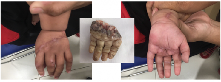 Sau 10 ngày sau hậu phẫu, sức khỏe bệnh nhi đã hồi phục, ăn uống tốt, không sốt, không có dấu hiệu nhiễm trùng nhiễm độc; bàn tay trái của bé được phục hồi và tiên lượng sống tốt, các ngón tay hồng hào trở lại.