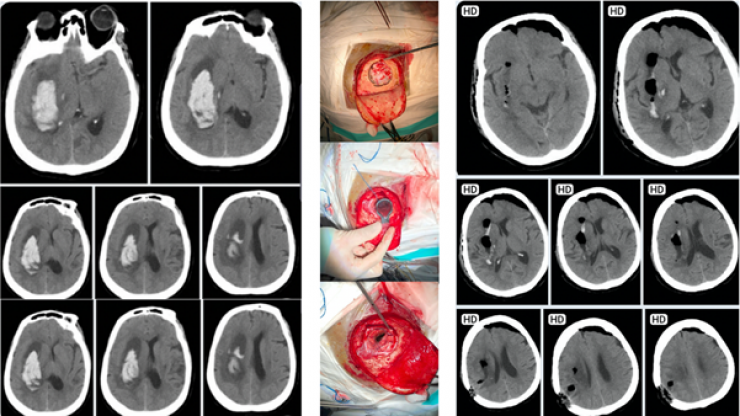 Ngày 16/06/2019, Bệnh viện Nhân dân 115 tiếp nhận một người bệnh nữ, 62 tuổi với chẩn đoán xuất huyết não ngày 2, tăng huyết áp, nhập viện trong tình trạng lơ mơ, liệt nữa người trái. Lúc nhập viện người bệnh hôn mê, Glasgow 10 điểm (E=2, V=3, M=5), liệt ½ người trái, được tiến hành chụp CT sọ não ghi nhận xuất huyết não cấp tính tạo khối máu tụ bán cầu phải, chèn ép các cấu trục kế cận, tổn thương vỡ vào não thất bên bên phải làm tụ máu não thất bên bên phải, kèm thương tổn não cũ vùng nhân đậu trái. Bác sĩ chuyên khoa ngoại thần kinh quyết định phẫu thuật lấy máu tụ bằng phương pháp xâm lấn tối thiểu với sự hỗ trợ của robot Modus V Synaptive, sử dụng ống “brain path” để lấy khối máu tụ. Người bệnh được gây mê toàn thân, đặt tư thế đầu nghiêng trái nhẹ, rạch da thái dương – đính sau phải, đường thẳng 4cm, bộc lộ sọ, khoan mở sọ tối thiểu một lỗ 3cm đường kính vào cực dưới khối máu tụ. Qua hệ thống robot, mở màng cứng, đốt nhẹ vỏ não. Dùng drain path chọc dò theo hướng dẫn định vị đi vào cực dưới khối máu tụ. Máu tụ tự trào ra theo áp lực trong sọ và theo hướng trọng lực cao thấp, hạn chế hút máu tụ. Đánh giá lượng máu cục còn sót lại không đáng kể, cầm máu bằng keo Floseal. Hậu phẫu ngày 01: người bệnh còn thở qua nội khí quản, kết quả chụp CT sọ não sau mổ ngày 17/06/2019 ghi nhận khối máu tụ đã được lấy hết, cấu trúc đường giữa đã trả lại vị trí bình thường, khí trong sọ. Hậu phẫu ngày 2: người bệnh được rút ống nội khí quản, chuyển khoa Ngoại Thần kinh theo dõi. Hậu phẫu ngày 3,4: tri giác người bệnh cải thiện đáng kể, Glasgow 13 điểm (E=4, V= 4, M=5), còn yếu ½ người trái. Thở êm, vết mổ khô sạch, không sốt. Hậu phẫu ngày 5: Người bệnh ổn định, được chuyển bệnh viện Phục hồi chức năng điều trị tiếp.