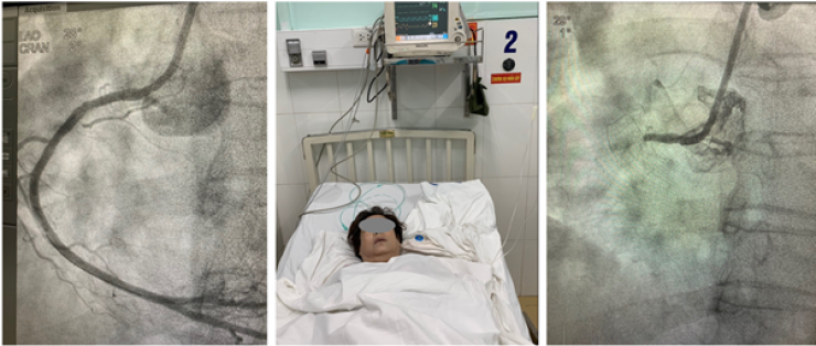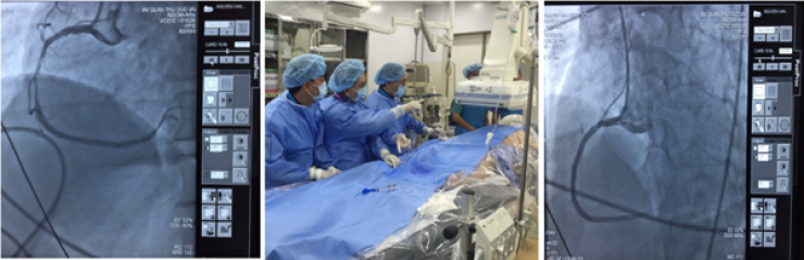 Lúc 15g30 cùng ngày, xe cứu thương đến BV Nguyễn Tri Phương, bệnh nhân vẫn trong tình trạng HA thấp, nhịp tim chậm. Ngay lập tức, bệnh nhân được đưa đến khoa Tim mạch Can thiệp của BV Nguyễn Tri Phương, kết quả chụp động mạch vành cho thấy tắc đoạn gần động mạch vành phải và hẹp nặng 2 nhánh còn lại. Các bác sĩ chuyên khoa đã tiến hành can thiệp đặt 1 stent trên động mạch vành phải cho bệnh nhân. Ngay sau can thiệp, bệnh nhân tỉnh táo, hết đau ngực, mạch huyết áp trở về bình thường và ngưng được thuốc vận mạch, và được xuất viện vài ngày sau đó.