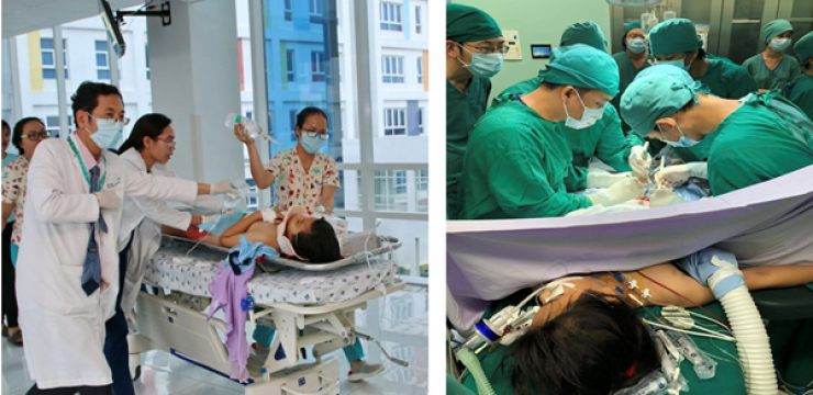 Ngày 25/10/2019, khi xe cứu thương của Bệnh viện tỉnh Bình Thuận dừng bánh tại khoa Cấp cứu của BV Nhi Đồng 1, cũng là lúc nhịp tim của bé gái 12 tuổi V.N.T.O trở nên rời rạc và ngưng đập ngay sau đó. Ngay lập tức, bé được đặt nội khí quản giúp thở, xoa bóp tim ngoài lồng ngực đồng thời dùng thuốc kích thích tim hoạt động lại và được đưa ngay vào khoa Hồi sức tích cực. Các bác sĩ tim mạch tiến hành đặt ngay máy tạo nhịp tạm thời, trong khi đó, các bác sĩ hồi sức của Bệnh viện Nhi Đồng 1 với sự hỗ trợ của các bác sĩ Bệnh viện Chợ Rẫy tiến hành kỹ thuật ECMO cho bệnh nhi. Tất cả đều diễn ra khẩn trương nhưng nhịp nhàng. 1 giờ sau, tim của bé đã đập lại và tình trạng huyết động cải thiện hơn. 2 giờ trước đó, khi nhận được tín hiệu báo động đỏ cần được hỗ trợ từ xa, bác sĩ khoa Cấp cứu của Bệnh viện Nhi Đồng 1 liên tục hướng dẫn qua điện thoại cho bác sĩ trên xe cứu thương, “bác tài” thì tập trung cao độ để xe cứu thương chạy với tốc độ nhanh nhất có thể nhưng vẫn đảm bảo an toàn, trong khi đó, các bác sĩ khoa Hồi sức tích cực và Chống độc của Bệnh viện Chợ Rẫy khẩn trương mang theo thiết bị bổ sung cần thiết để thực hiện kỹ thuật ECMO ngay khi bệnh nhân được chuyển đến,…