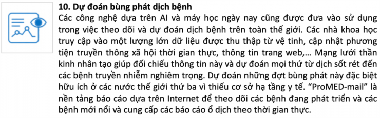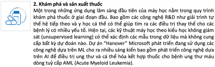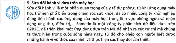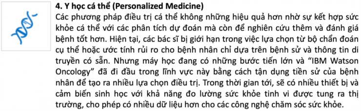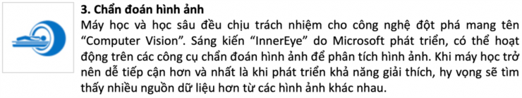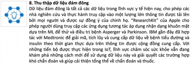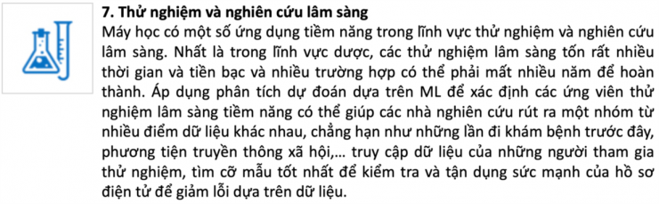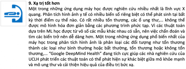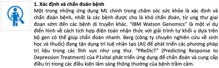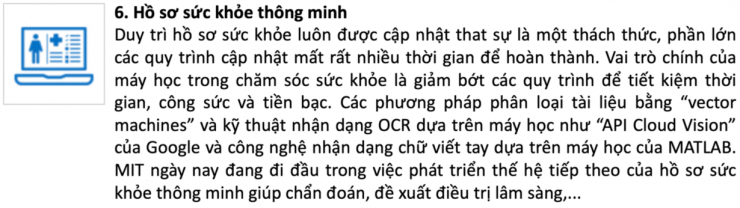 Số lượng ứng dụng của máy học ngày càng tăng trong lĩnh vực chăm sóc sức khỏe, dự báo tương lai sẽ khá phổ biến khi tìm thấy các ứng dụng dựa trên máy học được nhúng với dữ liệu bệnh nhân theo thời gian thực sẽ luôn có sẵn từ các hệ thống chăm sóc sức khỏe khác nhau ở nhiều quốc gia, do đó làm tăng hiệu quả của các lựa chọn điều trị mới.