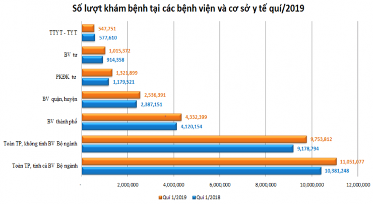 Tổng số lượt khám tăng 6,5%, trong đó: BV bộ ngành tăng 7,9%, BV TP tăng 5,2%, BV quận huyện tăng 6,2%, BV tư tăng 11%, PKĐK tư tăng 12,1% , trong khi đó số lượt khám tại các Trung tâm Y tế quận, huyện và các Trạm Y tế giảm 5,2%:
