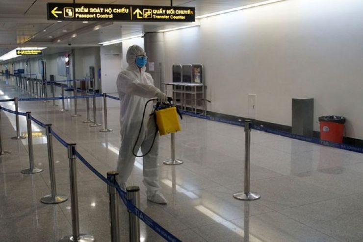 Khử khuẩn sân bay sau khi hành khách rời sân bay đến khu cách ly ở Cần Giờ. Ảnh: HOÀNG HÙNG
