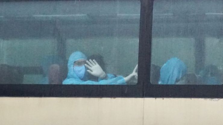 Hành khách di chuyển ra xe về khu cách ly. Ảnh: HOÀNG HÙNG