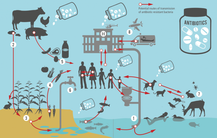 Tóm tắt các con đường truyền vi khuẩn kháng thuốc giữa động vật, con người và môi trường (WHO, 2019)