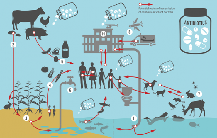 Tóm tắt các con đường truyền vi khuẩn kháng thuốc giữa động vật, con người và môi trường (WHO, 2019)