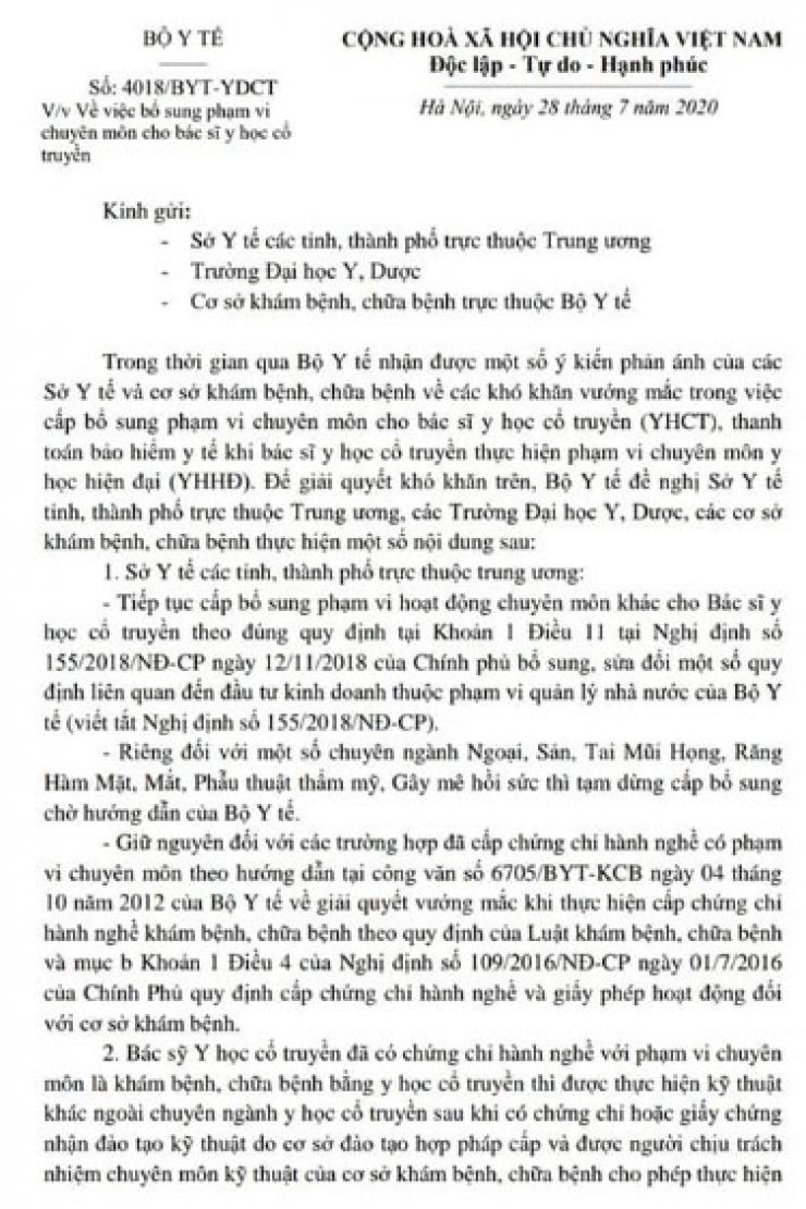 Theo công văn, bác sĩ YHCT đã có chứng chỉ hành nghề với phạm vi chuyên môn là khám bệnh chữa bệnh bằng YHCT thì được thực hiện kỹ thuật khác ngoài chuyên ngành YHCT sau khi có chứng chỉ hoặc giấy chứng nhận đào tạo kỹ thuật do cơ sở đào tạo hợp pháp cấp và được người chịu trách nhiệm chuyên môn kỹ thuật của cơ sở khám chữa bệnh cho phép thực hiện bằng văn bản mà không cần bổ sung phạm vi hoạt động chuyên môn ghi trên chưng chỉ hành nghề theo quy định.