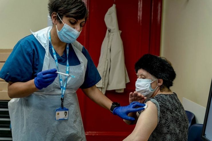 Một cụ bà 74 tuổi được tiêm vaccine Covid-19 của Pfizer tại Trung tâm Bloomsbury Surgery ở London, tháng 1/2021. Ảnh: NY Times