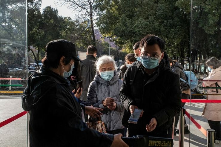 Nhân viên bệnh viện Zhongnan ở Vũ Hán quét mã QR xác nhận thông tin sức khoẻ người dân tại lối ra vào. Ảnh: NY Times