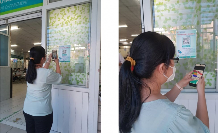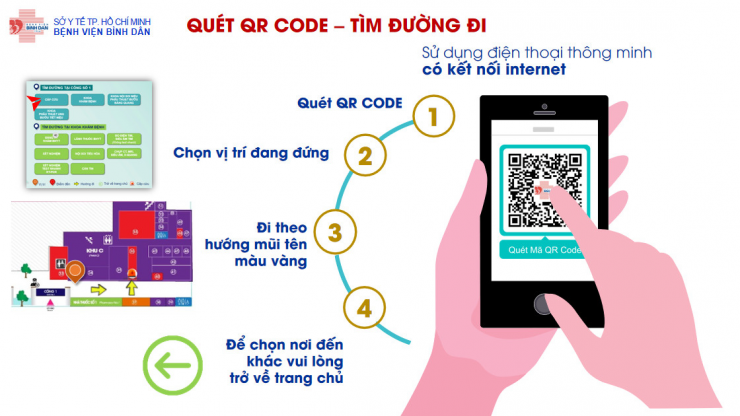 Chỉ bằng thao tác quét mã QR, người dùng nhanh chóng có được hướng dẫn đường đi từ vị trí mình đang đứng đến khu vực cần đến như nơi khám bệnh, xét nghiệm, nhà thuốc, khu làm hồ sơ nhập viện và cảnh báo những khu vực có nguy cơ lây nhiễm cao.