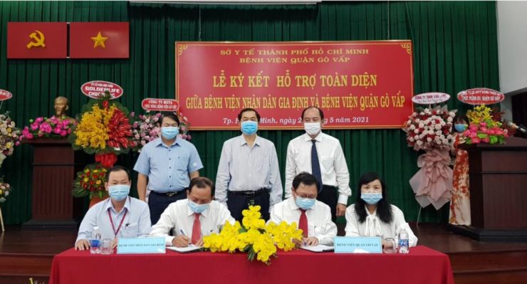 Lãnh đạo quận Gò Vấp, lãnh đạo Sở Y tế chứng kiến lễ ký kết hỗ trợ toàn diện giữa Bệnh viện Nhân Dân Gia Định và BV quận Gò Vấp (20/05/2021)