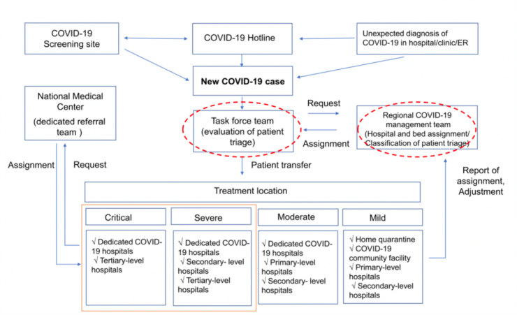 Do đó, các địa điểm và cơ sở tiếp nhận và điều trị bệnh nhân COVID-19 được xác định mang tầm chiến lược bằng sự hợp tác giữa nhân viên y tế của các bệnh viện và đội đặc nhiệm. Cụ thể, khi một trường hợp mắc COVID-19 được xác nhận, ngay lập tức sẽ thông báo đến đội đặc nhiệm (force team) và đội quản lý COVID-19 khu vực (Regional COVID-19 management team). Đội quản lý COVID-19 khu vực sẽ chỉ định cho bệnh nhân được chuyển đến bệnh viện nào để chuẩn bị giường bệnh và các trang thiết bị y tế sẵn sàng xử lý phù hợp với mức độ nghiêm trọng của bệnh.