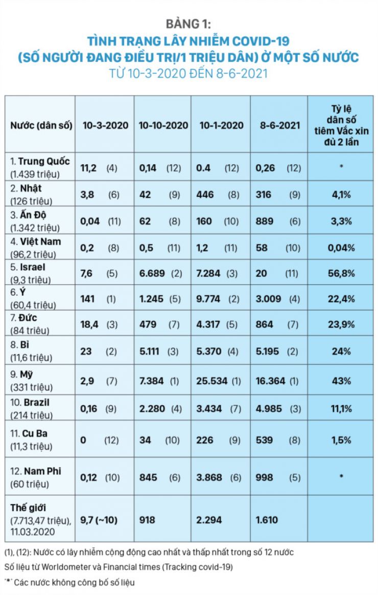 Đáng chú ý là có một số nước tỷ lệ người điều trị/1 triệu dân ngày 8-6-2021 cao hơn nhiều lần so với ngày 10-10-2020: Ấn Độ gấp hơn 14 lần (889 người so với 62 người), Cu Ba gấp hơn 15 lần (539 người so với 34 người), Nhật gấp 7,5 lần (316 người so với 42 người), Việt Nam gấp 116 lần (58 người so với 0,5 người), BẢNG 1. Cả 4 nước này tỷ lệ người dân tiêm đủ 2 lần Vắc xin rất thấp, dưới 4,5% dân số.