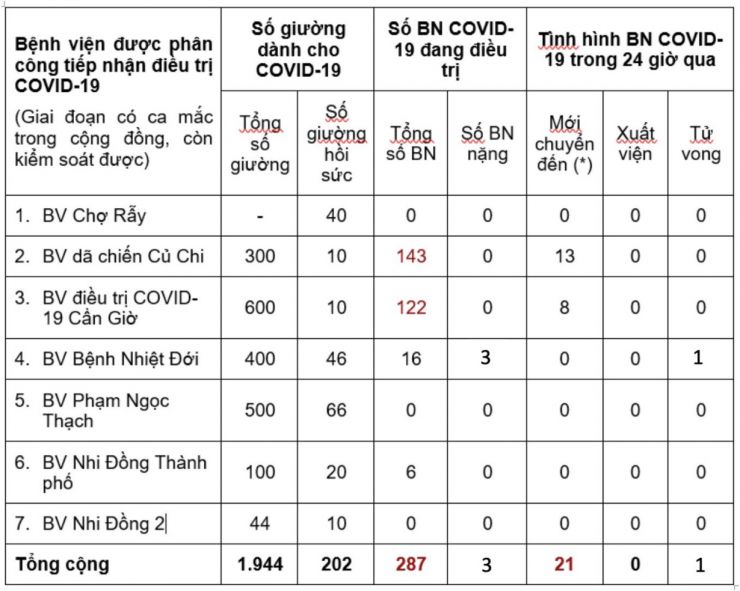 - BV Dã chiến Củ Chi tiếp nhận bệnh nhân (+) từ Khu cách ly Quận Phú Nhuận (3), Khu cách ly Quận Tân Phú (2), Khu cách ly Quận Bình Tân (2), Khu cách ly Khách sạn Cititel Parview Sài Gòn - Q.1 (1), Khu cách ly Quận 12 (1), Khu cách ly Đại học Huflit Hóc Môn (1), Khu cách ly Quận 3 (2), Khu cách ly Quận 8 (1)