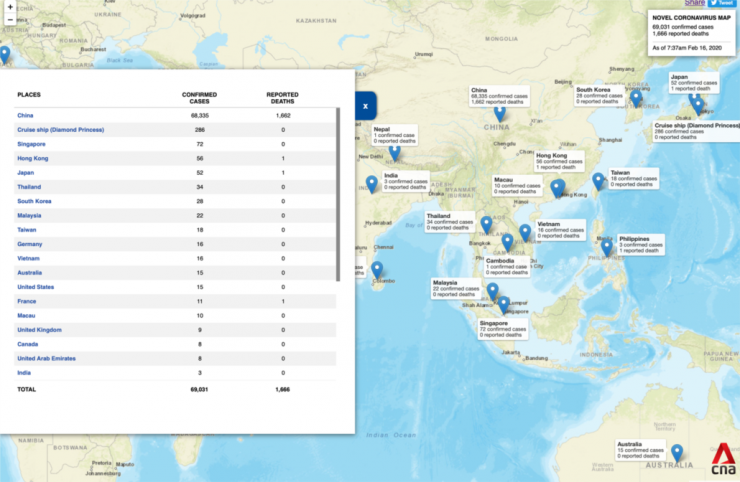 Theo Infographic cập nhật liên tục tình hình dịch bệnh viêm đường hô hấp do chủng mới của vi rút corona (nCoV) trên thế giới của kênh truyền thông Channel NewsAsia (CNA), tính đến 07g37ph ngày 16/02/2020, số ca mắc là 69.031 số ca chết là 1.666 (1.355 ở TQ, 1 ở Phillippines, 1 ở Hong Kong, 1 Pháp, 1 ở Nhật Bản).
