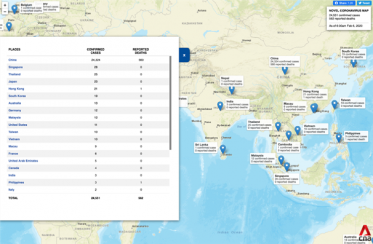 Theo Infographic cập nhật liên tục tình hình dịch bệnh viêm đường hô hấp do chủng mới của vi rút corona (nCoV) trên thế giới của kênh truyền thông Channel NewsAsia (CNA), tính đến 6g00ph ngày 06/02/2020, số ca mắc là 24.551, số ca chết là 562 (560 ở TQ, 1 ở Phillippines, 1 ở Hong Kong).