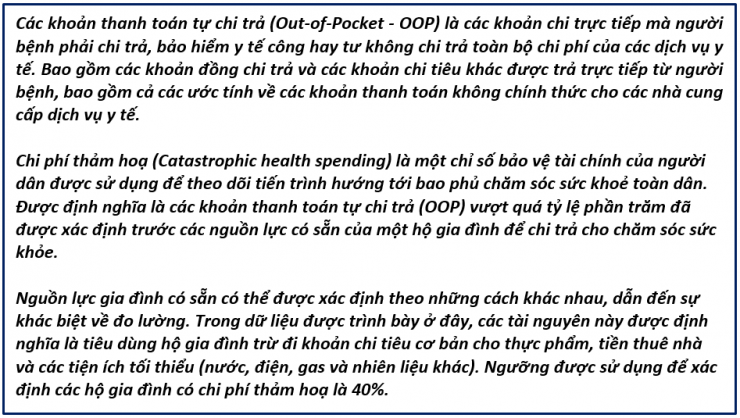 Tại các nước thuộc khối OECD (Tổ chức Hợp tác và Phát triển Kinh tế - Organization for Economic Cooperation and Development), trung bình có hơn 20% các khoản chi cho chăm sóc sức khỏe mà người dân phải tự chi trả (OOP). Không ít người gặp khó khăn về tài chính khi gánh nặng của các khoản tự chi trả lớn như vậy, nhất là các hộ nghèo và những người phải trả tự chi trả khoản tiền điều trị lâu dài do bệnh mạn tính sẽ đặc biệt dễ bị tổn thương.