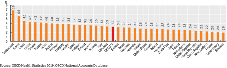 Tỷ lệ chi tiêu của hộ gia đình dùng để chăm sóc sức khỏe giúp đánh giá tổng hợp về gánh nặng tài chính của chi trả trực tiếp. Trên khắp các quốc gia thuộc OECD, có khoảng 3% tổng chi tiêu của hộ gia đình là dành cho chăm sóc sức khỏe, từ khoảng 2% ở Pháp, Luxembourg và Slovenia, đến hơn 5% ở Hàn Quốc và gần 7% ở Thụy Sĩ.