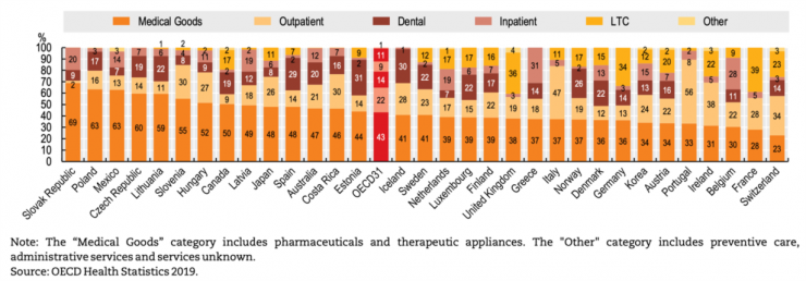 Các hệ thống y tế ở các nước OECD khác nhau có tỷ lệ khác nhau trong chi tiêu cho thuốc, vật tư y tế và các dịch vụ y tế khác nhau. Phân tích các chi tiêu chính của hộ gia đình cho y tế chủ yếu là thuốc và các mặt hàng y tế khác, kế đến là chi tiêu cho chăm sóc ngoại trú. Hai loại chi trả này thường chiếm gần 2/3 tổng chi tiêu của hộ gia đình cho chăm sóc sức khỏe. Chi tiêu cho chăm sóc nha khoa và chăm sóc sức khỏe dài hạn (các bệnh mạn tính) cũng khá cao, trung bình lần lượt là 14% và 11% tổng chi tiêu trực tiếp OOP cho sức khỏe. Chăm sóc nội trú chỉ chiếm một tỷ lệ khá nhỏ (9%) trong tổng chi tiêu OOP.