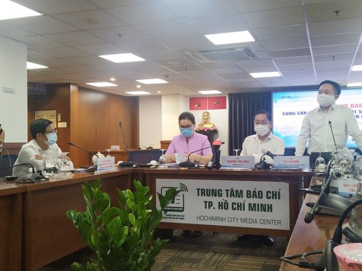 Đại diện Trung tâm Kiểm soát bệnh tật TP HCM, UBND quận 6, Sở Y tế TP và Sở Thông tin - Truyền thông TP (từ trái qua) tại buổi họp báo