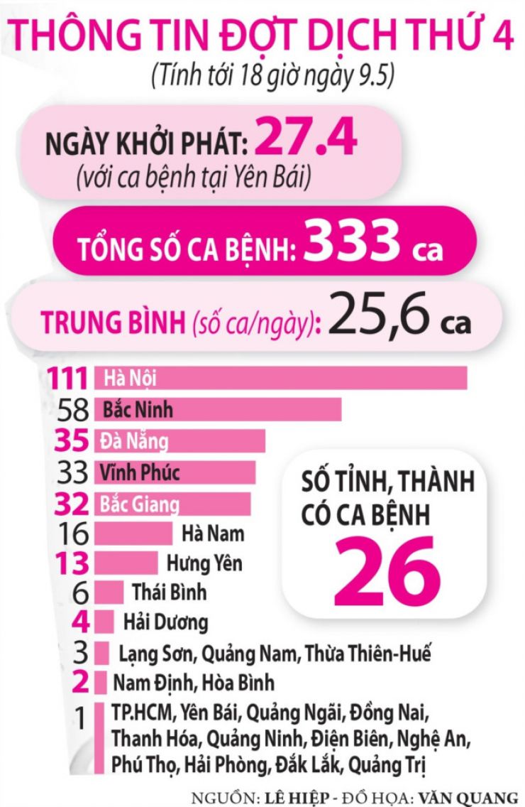 Trong đó, 10 ca nhập cảnh được cách ly ngay sau khi nhập cảnh (tại Hà Tĩnh 1 ca, Tiền Giang 2 ca, Vĩnh Long 5 ca, Hà Nội 1 ca và Quảng Trị 1 ca); 92 ca lây nhiễm trong nước, ghi nhận tại Bệnh viện (BV) Bệnh nhiệt đới T.Ư cơ sở 2 ở H.Đông Anh (Hà Nội) 6 ca; Đắk Lắk 1 ca; Hà Nam 1 ca, Lạng Sơn 2 ca, Bắc Giang 31 ca, Bắc Ninh 15 ca, Hà Nội 11 ca, Hưng Yên 2 ca, Hòa Bình 2 ca, Đà Nẵng 17 ca, Huế 2 ca, Quảng Nam 1 ca và Quảng Trị 1 ca. Các ca lây nhiễm trong nước liên quan ổ dịch BV Bệnh nhiệt đới T.Ư, BV K, ổ dịch tại Đà Nẵng và F1 của các BN đã công bố trước đó.