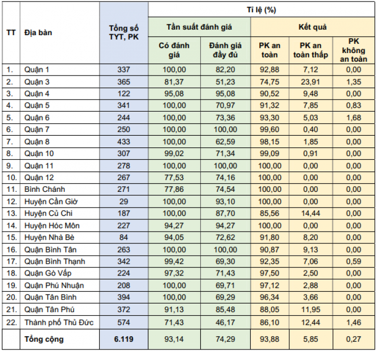 Theo quy định của Bộ Y tế, các PK phải đánh giá định kỳ ít nhất một lần trong 30 ngày, do đó, tỉ lệ các TYT, PK đánh giá đầy đủ đạt tỉ lệ 74,29%. Sở Y tế ghi nhận sự tham gia nghiêm túc của các phòng khám trên địa bàn quận 1, 5, 6, 7, 8, 11, Cần Giờ, Củ Chi, Bình Tân, Phú Nhuận, Tân Bình (đã có 100% PK tham gia đánh giá. Đồng thời, Sở Y tế yêu cầu Phòng Y tế các quận tăng cường nhắc nhỡ các PK tuân thủ tự đánh giá theo yêu cầu của Bộ Y tế, bao gồm: quận 12, huyện Bình Chánh, TP Thủ Đức, quận 3.