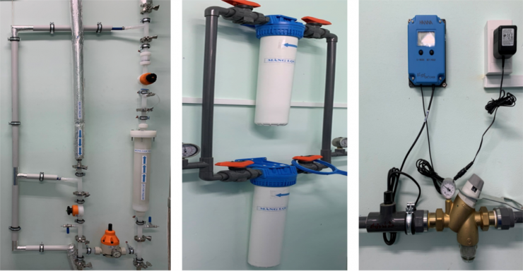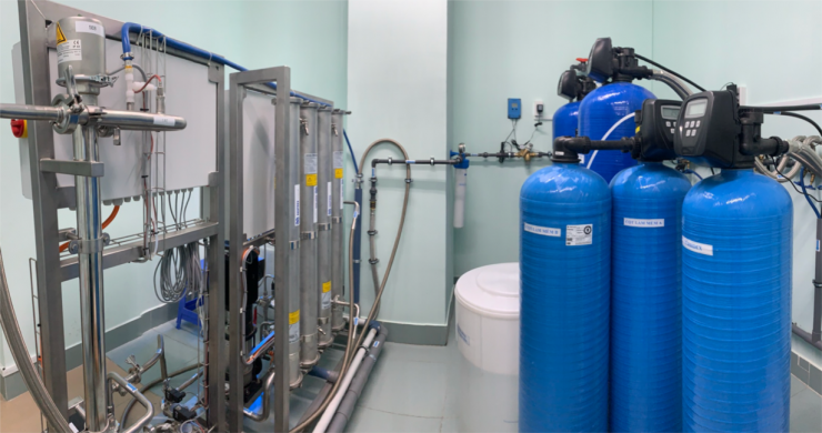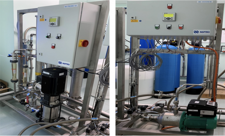(2) Hệ thống RO Medical + HC Medical với module 4 màng lọc nước RO: là hệ thống xử lý nước đạt chất lượng nước siêu tinh khiết (ultrapure) được sử dụng trong lọc máu; Tự động xả theo chu kỳ; Có chế độ vận hành bằng tay khẩn cấp trong trường hợp hỏng bộ điều khiển, tự động tái khởi động sau khi mất nguồn điện;