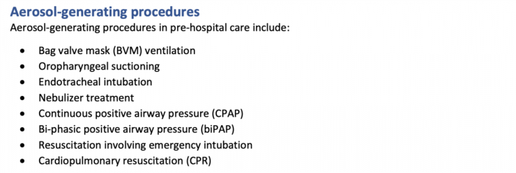 Ví dụ vấn đề thông khí trên xe cứu thương, TCYTTG nhấn mạnh nên tối ưu hóa chiến lược thông gió trong xe cứu thương để giảm nguy cơ phơi nhiễm cho nhân viên y tế. Chiến lược này bao gồm: cho khối lượng trao đổi không khí trong xe cứu thương đạt mức tối đa (ví dụ: mở các cửa sổ và lỗ thông hơi) và đặt tất cả các nút điều khiển thông khí sang chế độ lấy không khí trong lành từ bên ngoài (không tuần hoàn lại không khí trong xe), điều này áp dụng cho cả khoang lái xe và khoang bệnh nhân (nếu là 2 khoang riêng biệt). Trường hợp xe cứu thương không có khoang riêng biệt giữa khoang lái xe và khoang bệnh nhân, có thể tạo ra áp suất âm trong khu vực có bệnh nhân bằng cách mở các lỗ thông hơi bên ngoài và bật quạt hút khí trong xe xả ra phía sau lên mức cao nhất. Ngoài ra, TCYTTG cũng nhấn mạnh những tình huống có tạo ra khí dung trên xe cứu thương, cũng như khuyến cáo sử dụng dụng cụ phòng hộ cá nhân theo từng tình huống cụ thể, đặc biệt lưu ý các trường hợp cấp cứu có tạo ra khí dung.