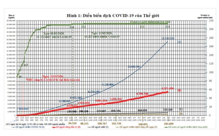 Dịch Covid-19 diễn ra từ tháng 01/2020 tại Trung Quốc, đến nay đã lan ra 213 nước, với quy mô và tốc độ chưa từng có. Ngày 10/01/2020 có người chết đầu tiên vì Covid-19 tại Vũ Hán, ngày 2/4/2020 có 204 nước bị mắc Covid-19, 1 triệu người bị nhiễm và 53,1 nghìn người chết. 3 tháng sau, ngày 3/7/2020 tức là sau 6 tháng có dịch, số người bị mắc Covid-19 là 11 triệu người và số người chết là 532,8 nghìn người. Dự báo ngày 11/8/2020 sẽ có hơn 20 triệu người mắc Covid-19 trên thế giới (Hình 1). Virus Corona chủng mới (gọi là SARS-CoV-2) đã phải cần đến 92 ngày để lây lan đến 1 triệu người mắc đầu tiên trên toàn thế giới, song chỉ cần 13 ngày là lây thêm 1 triệu người và bây giờ chỉ cần 4 ngày là có thêm 1 triệu người mắc Covid-19 trên thế giới.