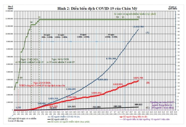 Châu Mỹ với 53 nước, khoảng 1.014 triệu dân, là lục địa có số lượng người mắc Covid-19 mạnh nhất thế giới, với 10.612.762 người mắc, 388.022 người chết và 3.875.705 người đang điều trị ở các bệnh viện. Ðến nay, sau 200 ngày Covid-19 lây nhiễm ở Châu Mỹ, số người mắc và người đang điều trị tiếp tục tăng, chưa biết khi nào thì mới giảm (Hình 2). Cứ 1 triệu dân thì có hơn 10.000 người mắc, 3.800 người đang điều trị ở bệnh viện và gần 400 người chết.