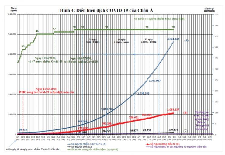 Châu Á với 48 nước, 4.490 triệu dân, có số người mắc cao hơn Châu Âu và xu hướng lây nhiễm vẫn tiếp tục tăng mạnh, tương tự ở Châu Mỹ, với 4.624.742 người mắc, 100.876 người chết và 1.083.137 người đang điều trị ở các bệnh viện (Hình 4). Cứ 1 triệu dân thì có hơn 1.000 người mắc, hơn 200 người đang điều trị và 22 người chết.
