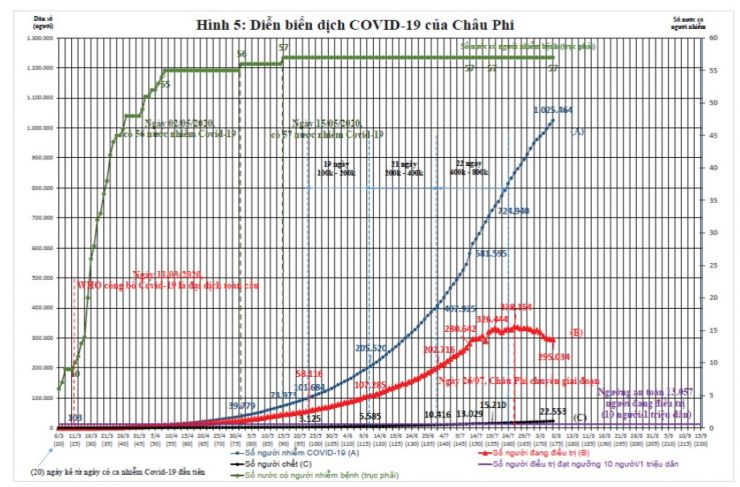 Châu Phi với 57 nước, 1.886 triệu dân, có quá trình lây nhiễm chậm hơn Châu Á 25 ngày, mức độ lây nhiễm rất nhanh, với 1.025.464 người mắc, 22.553 người chết và 295.034 người đang điều trị (Hình 5). Cứ 1 triệu dân thì có 785 người mắc, 226 người đang điều trị và 17 người chết. Ðáng lưu ý là dường như Châu Phi đã đạt đỉnh dịch vào ngày 26/7/2020 với số người mắc đang điều trị là 338.154 người, sau đó giảm dần.