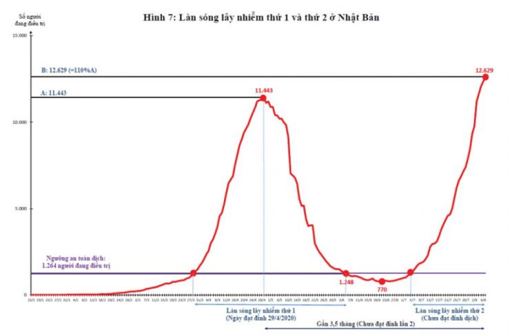 Dịch Covid-19 tại Nhật đã đạt đỉnh vào ngày 29/4/2020 với 11.443 người đang điều trị ở các bệnh viện (Hình 7). Ngày 5/6/2020, số người đang điều trị còn 1.248 người, đạt ngưỡng an toàn dịch của Nhật là 1.264 người (ngày 21/6/2020 chỉ còn 770 người đang điều trị). Tức là sau 143 ngày, Nhật đã khống chế dịch thành công. Tuy nhiên do mở cửa lại các hoạt động thương mại, sau đó 1 tháng, ngày 5/7/2020, Nhật đã bước vào làn sóng lây nhiễm Covid-19 thứ 2. Ðến nay, sau hơn 1 tháng, số người đang điều trị là 12.629 người, gấp 1,1 lần đỉnh dịch lần 1 (11.443 người - Hình 7) và chưa thể dự báo lúc nào làn sóng lây nhiễm thứ 2 sẽ đạt đỉnh dịch.