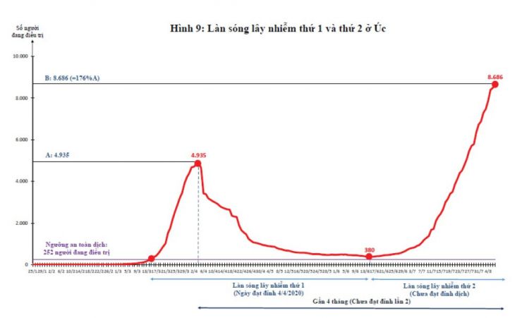 Úc đã đạt đỉnh dịch vào ngày 4/4/2020, với tổng số người mắc là 5.550 người, số người đang điều trị là 4.935 người (Hình 9). Ngày 15/6/2020 chỉ còn 380 người đang điều trị, cao hơn một chút ngưỡng an toàn dịch của Úc là 252 người đang điều trị. Tuy nhiên do từ giữa tháng 6/2020 Úc đã nới lỏng kiểm soát, mở cửa lại các hoạt động kinh tế khi chưa đạt ngưỡng an toàn dịch làm cho dịch bùng phát trở lại. Nước Úc bước vào làn sóng lây nhiễm Covid-19 lần 2 (Hình 9). Ðến ngày 7/8/2020 đã có 8.686 người đang điều trị ở các bệnh viện, gấp 1,76 lần khi dịch đạt đỉnh lần thứ 1 (4.935 người). Chưa có dấu hiệu cho thấy khi nào thì dịch đạt đỉnh lần 2 và khi nào đạt mức an toàn dịch.