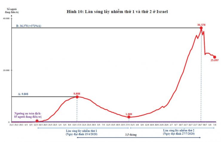 Israel đã đạt đỉnh dịch vào ngày 15/4/2020 với tổng số người mắc là 12.501 người, số người đang điều trị ở các bệnh viện là 9.808 người (Hình 10). Ngày 28/5/2020 đã giảm còn 1.909 người đang điều trị, nhưng vẫn cao gấp 22,5 lần ngưỡng an toàn dịch (85 người). Tuy nhiên, do Israel sớm nới lỏng kiểm soát từ cuối tháng 5/2020 nên sau đó dịch lại bùng phát. Ngày 27/7/2020, số người đang điều trị là 36.378 người, gấp 3,7 lần đỉnh dịch của làn sóng thứ 1 (9.808 người). Hiện nay, lây nhiễm của làn sóng thứ 2 đang giảm dần, song chưa biết bao giờ đạt ngưỡng an toàn dịch (Hình 10).