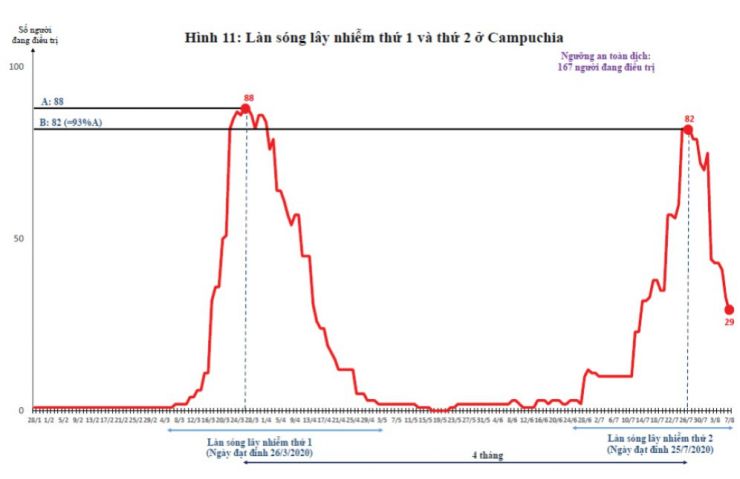 Với dân số 16,7 triệu người, ngưỡng an toàn dịch của Campuchia là 167 người bị nhiễm đang được điều trị. Từ khi có người bị lây nhiễm đầu tiên (ngày 28/01/2020), lúc cao nhất Campuchia chỉ có 88 người bị nhiễm đang được điều trị (Hình 11), sau đó giảm dần. Tức là Campuchia có làn sóng lây nhiễm lần thứ 1, đạt đỉnh ngày 26/3/2020, song chưa có dịch. Một thời gian dài, từ 03/5/2020 đến 26/6/2020, số người đang điều trị không quá 3 người. Tuy nhiên, từ 27/6/2020, số người nhiễm mới tăng nhanh, đến ngày 25/7/2020 là 82 người đang điều trị, bằng 93% khi đạt đỉnh làn sóng lây nhiễm lần thứ 1 (88 người). Do đó, Campuchia đang bước vào làn sóng lây nhiễm lần thứ 2 và đã đạt đỉnh vào ngày 25/7/2020. Hiện nay số người đang điều trị còn 29 người (Hình 11).